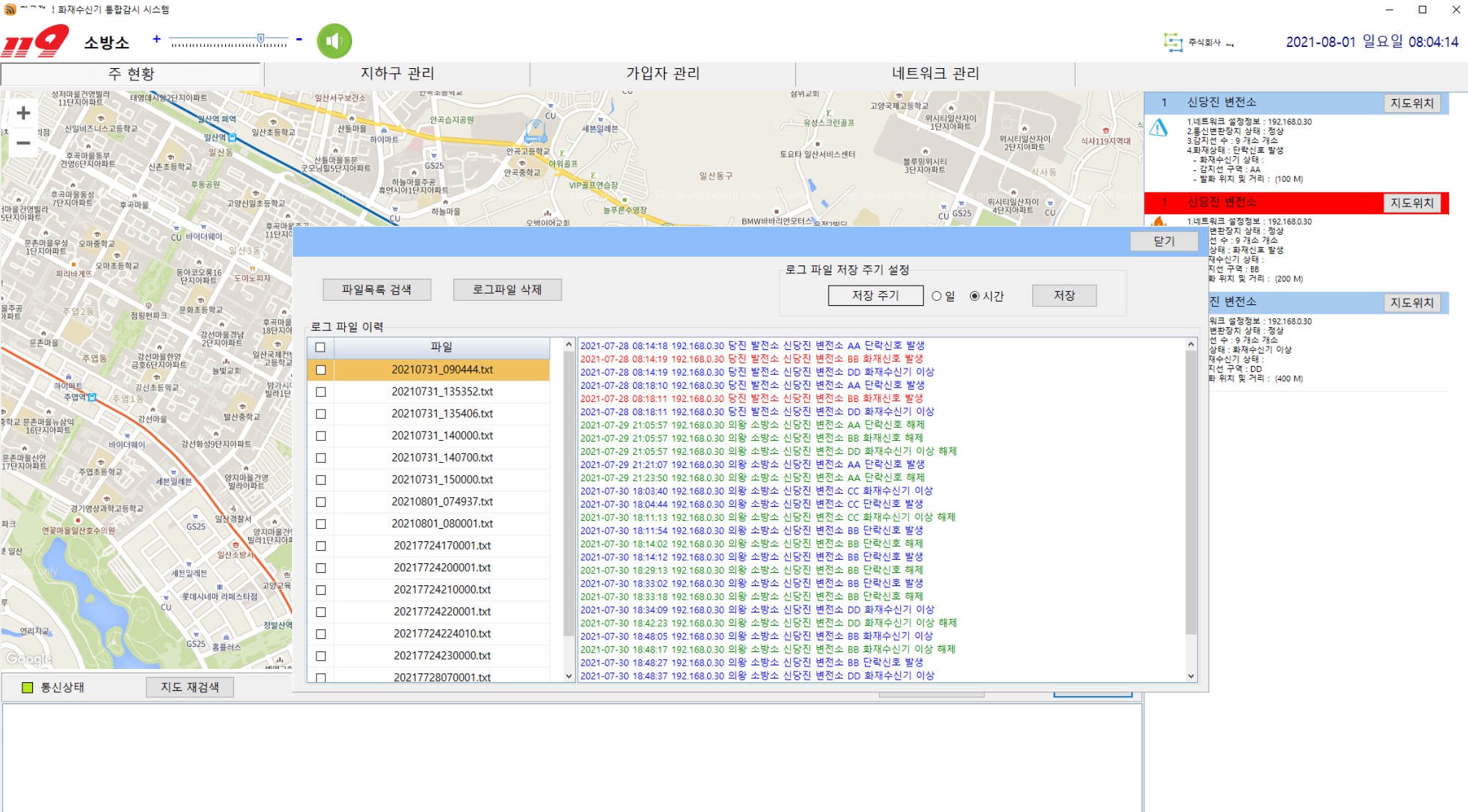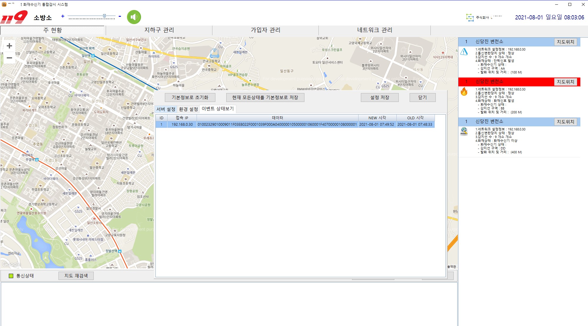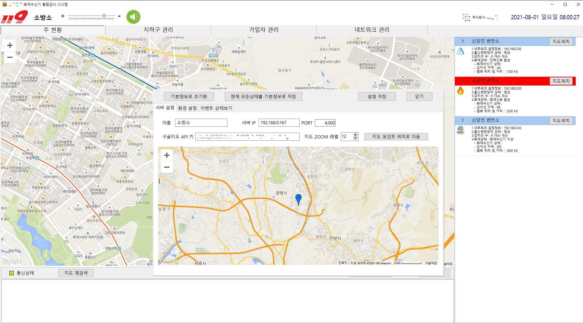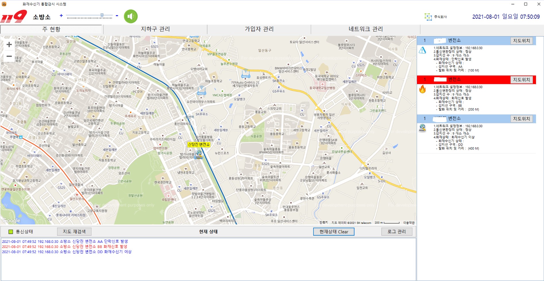 화재수신기로부터 화재발생 또는 통신이상이 감지되면위치를 지도에 표시하는 관제 시스템.