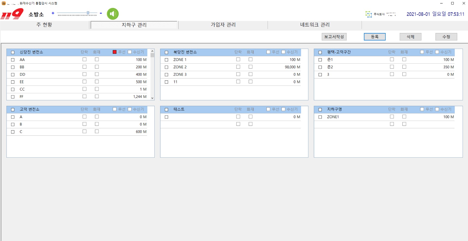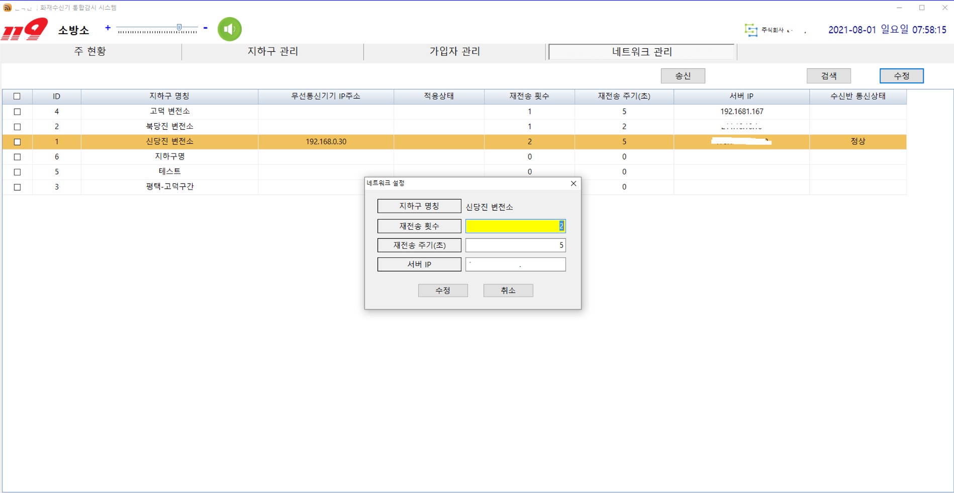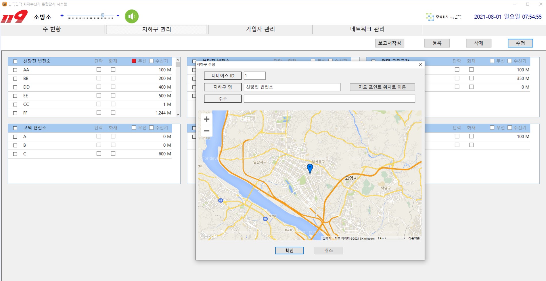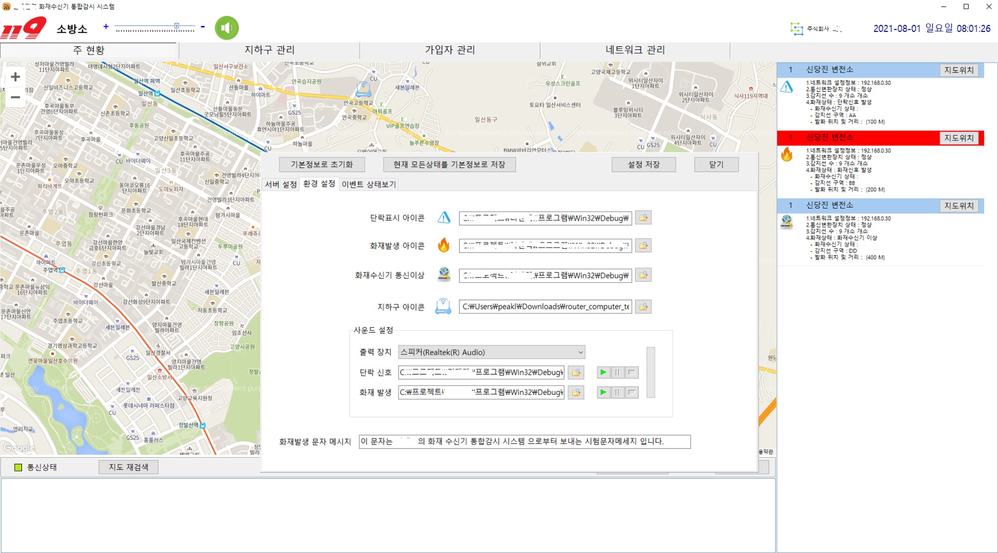 화재수신기로부터 화재발생 또는 통신이상이 감지되면위치를 지도에 표시하는 관제 시스템.
